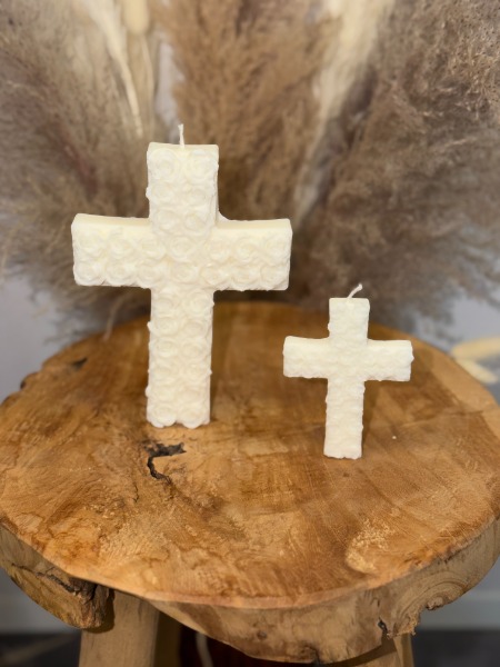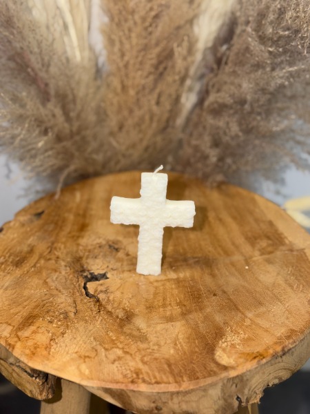 Découvrez notre bougie "Croix", fabriquée à partir de cire végétale de Colza.